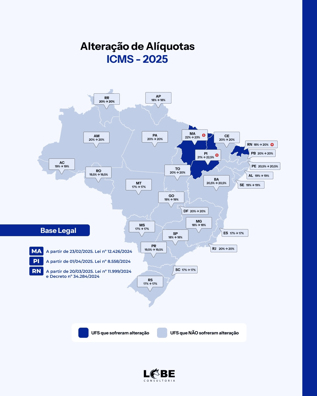 O Estado do Maranhão teve alteração de 22% para 23% nas alíquotas internas e interestaduais com efeitos a partir de 23 de fevereiro de 2025. O Estado do Piauí aumentou de 21% para 22,5% as alíquotas internas interestaduais com vigência a partir de 1º de abril de 2025. Por sua vez, o Rio Grande do Norte teve sua alíquota aumentada de 18% para 20%, passando a ser aplicada a partir do dia 20 de março de 2025, sendo também cobrado o adicional de 2% do FECOP para refrigerantes, bebidas isotônicas, energéticas, águas-de-colônia e produtos de beleza ou maquiagem.