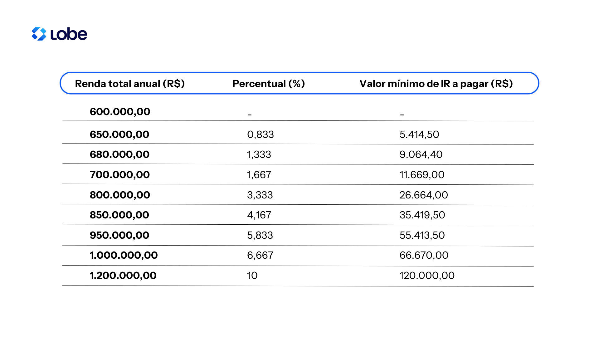 Conclusão importante: Apenas valores acima de R$ 1,2 milhão por ano terão a alíquota máxima de 10%.
